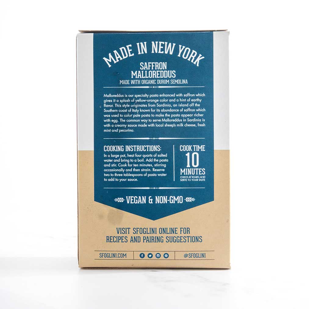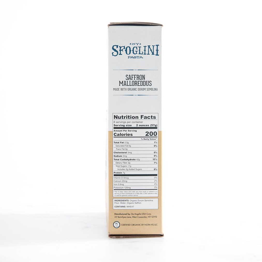 Ingredients: Organic Durum Semolina Flour, Water, Saffron. Contains: WHEAT.